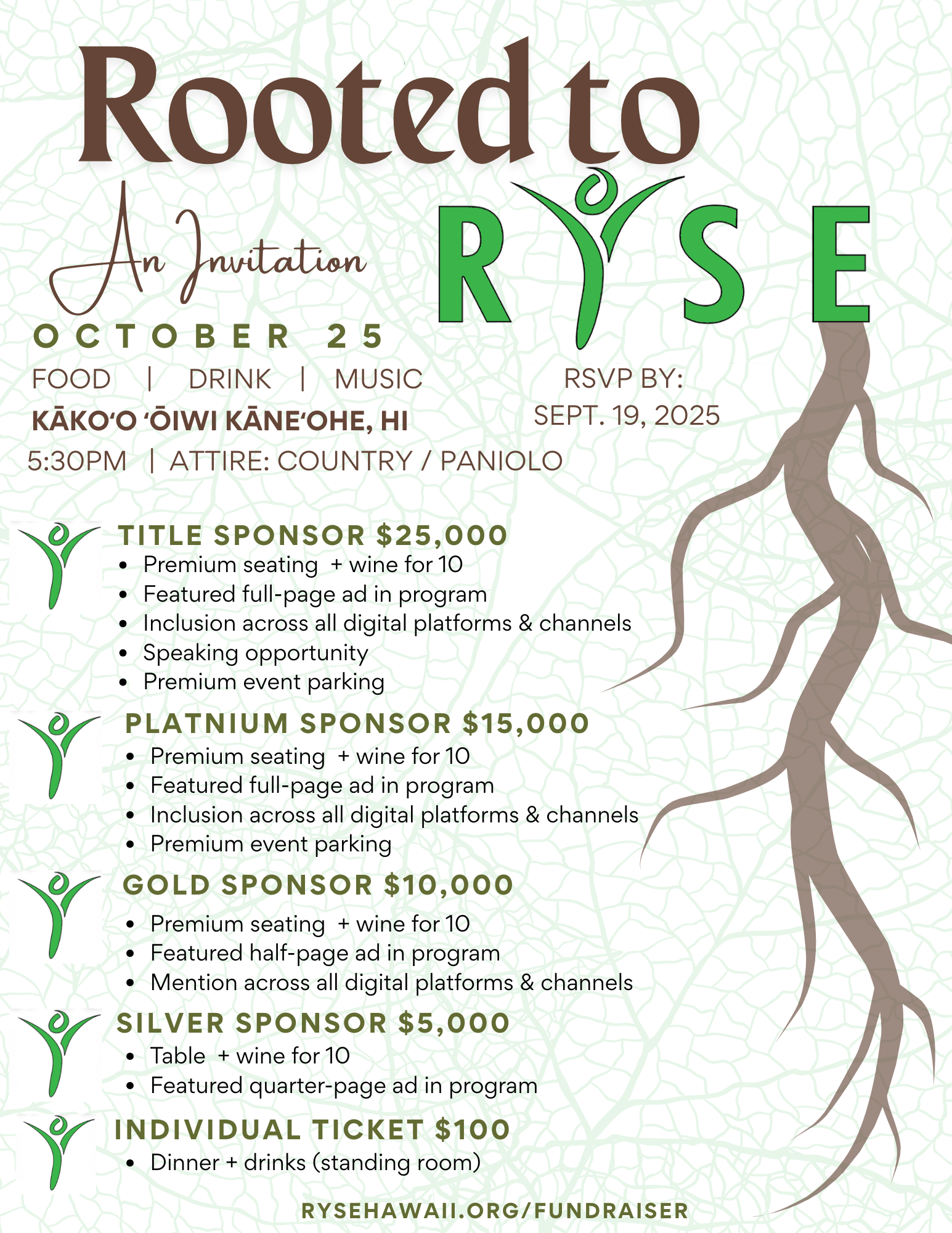 We are reaching out with great excitement to invite your support for Rooted to RYSE, our 2025 fundraiser and celebration, to be held on October 25 at Kākoʻo ʻŌiwi in Kāneʻohe. This uplifting evening will bring our community together under one goal: ending youth homelessness in Hawaiʻi and strengthening the support of our community.